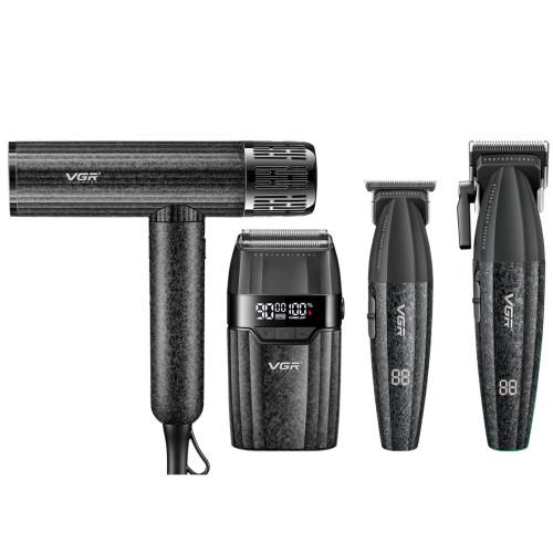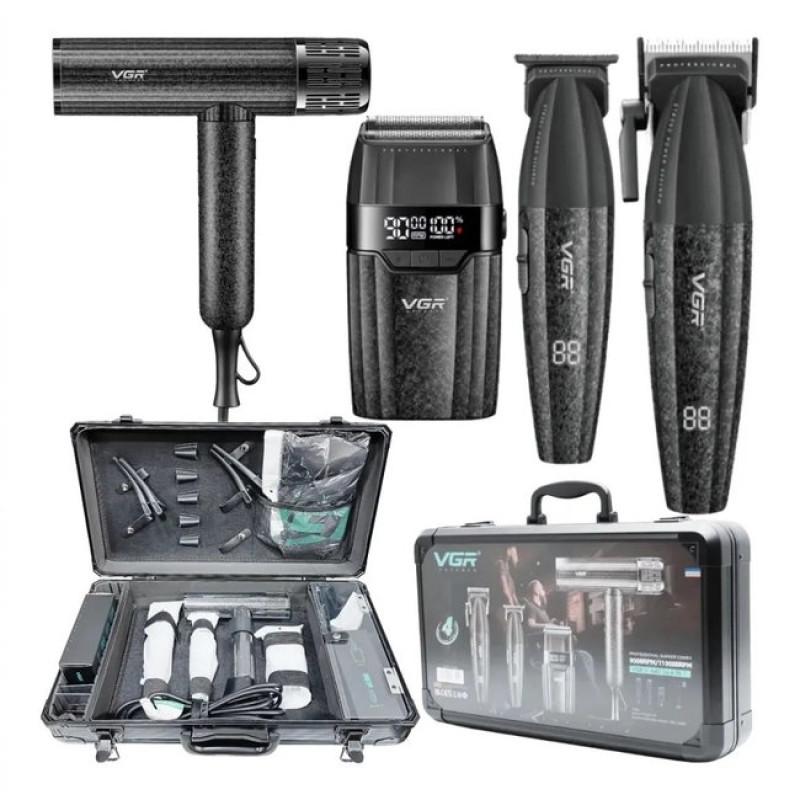 VGR V-640S4 Black - представляет собой максимально функциональный профессиональный набор, который состоит из популярных моделей: машинки V-003, шейвера V-906, триммера V-308 и фена V-640HD. Ультрасовременные и функциональные модели однозначно сделают вашу работу максимально комфортной, приятной и результативной, ведь они оснащены всеми необходимыми современными функциями и технологиями для комфортной качественной стрижки.