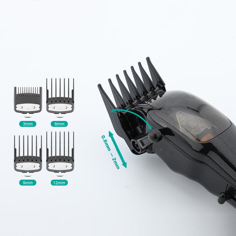 Модель VGR V-653 оснащена незнімним ножовим блоком завширшки 46 мм. Ножовий блок встановлений спеціальний механізм зміни довжини стрижки волосся на 5 фіксованих положень від 0.8 до 2 мм. Таким чином, Ви можете максимально точно підбирати необхідну довжину зрізу волосся, створюючи максимально плавні переходи без сходів. Верхнє рухоме лезо та нижнє нерухоме виготовлені з нержавіючої сталі з DLC покриттям (Diamond Like Carbon) – це дуже міцне та витривале покриття, яке дозволить ножу залишатися точним та гострим довгий час.
