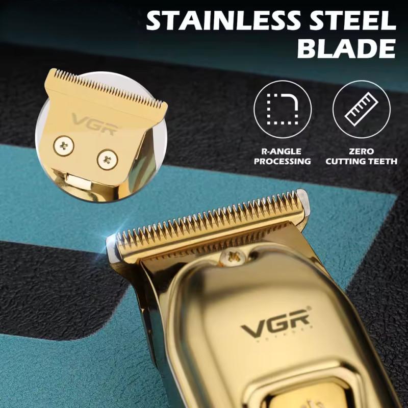 Модель VGR V-965 оснащена незнімним Т-подібним ножовим блоком завширшки 40 мм. Така форма ножового блоку дуже вдала, оскільки дозволяє одночасно захоплювати велику ширину для стрижки, а також комфортно працювати у складних зонах, забезпечуючи чистий зріз волосся. Ножовий блок виготовлений із нержавіючої сталі, має мінімальний зріз волосся 0.4 мм. Також ножі можна виставити в нульовий зазор zero overlap.